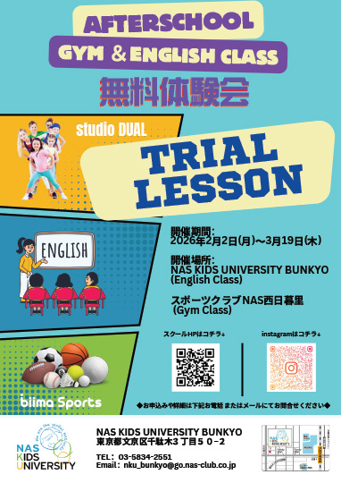 | 集合場所 | 【English Class】NAS KIDS UNIVERSITY BUNKYO 【Gym Class】スポーツクラブNAS西日暮里正面玄関前 |